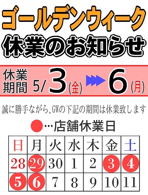 5月の営業カレンダー、GW休暇のお知らせ🎏